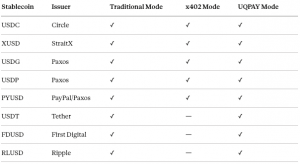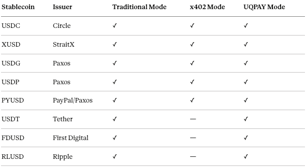 Supported Stablecoins Across Traditional, x402, and UQPAY Payment Modes